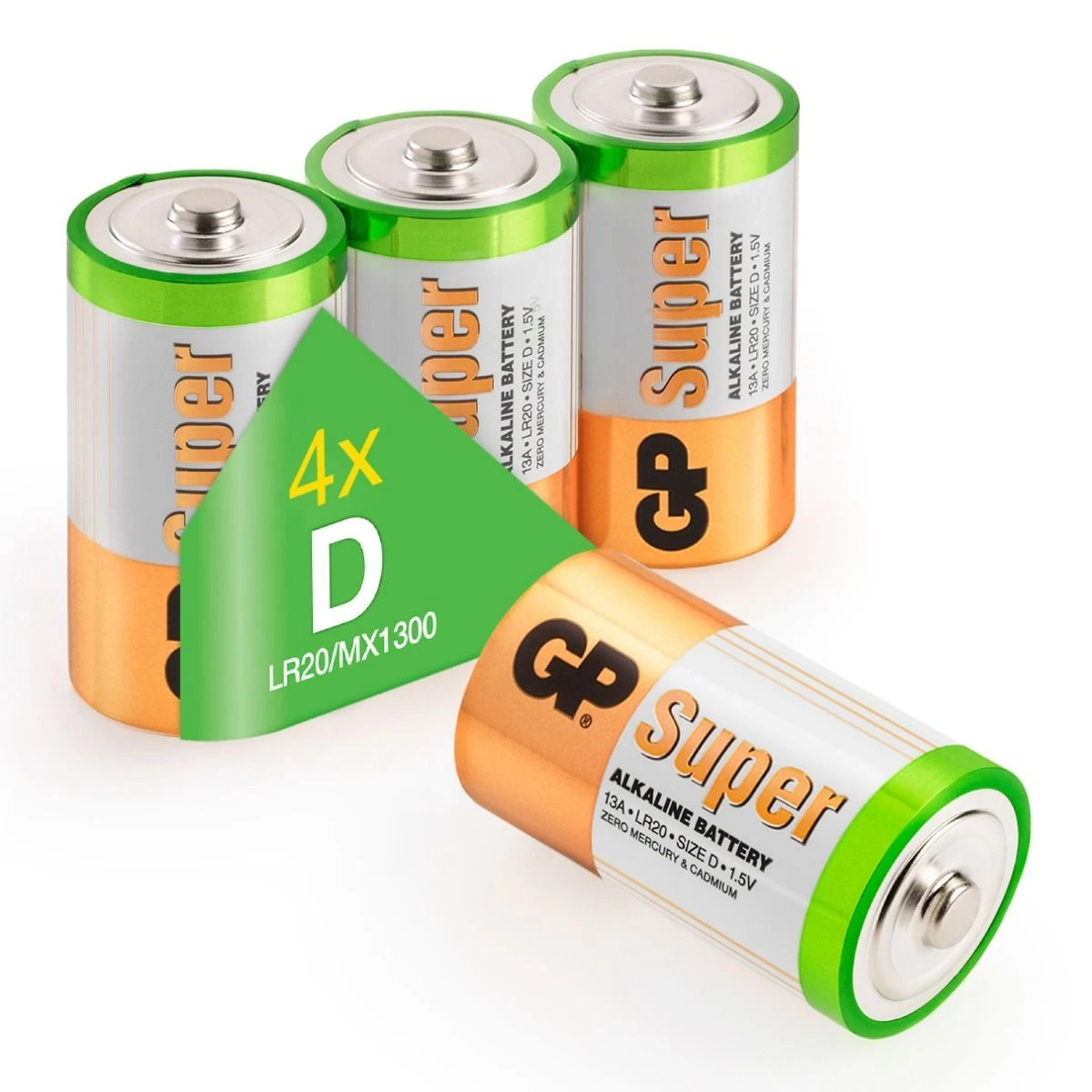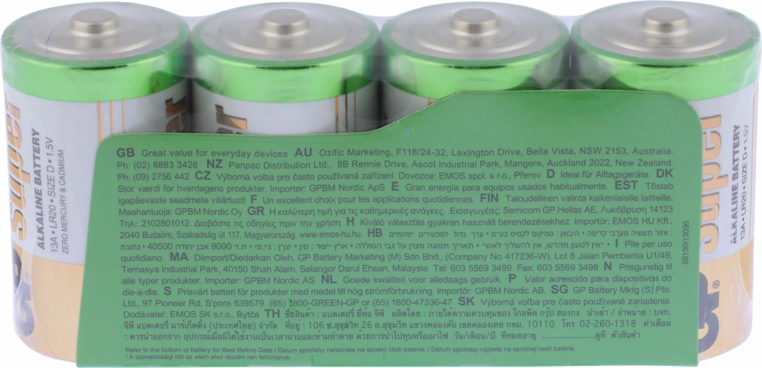 Formaat D-cell. Met de D van dik. Deze uit de kluiten gewassen alkaline batterij uit de GP Super Alkaline lijn, wordt ook wel grote staaf of monocel genoemd. Een krachtige batterij die geknipt is voor gebruik in zaklampen, speelgoed, maar ook in bijvoorbeeld uitrustingen (duiklamp) en gereedschap (laserapparatuur). Internationaal wordt de mono-batterij aangeduid met LR20. Van alkaline batterijen is algemeen bekend dat ze langer meegaan. Dat geldt zeker voor de GP Super alkaline lijn. Geprezen om zijn lange gebruiksduur. Ook kan het geen kwaad om een of meer batterijen achter de hand te houden of een voorraadje aan te leggen. De houdbaarheid is immers royaal te noemen: tot tien jaar. Verpakking met vier stuks.